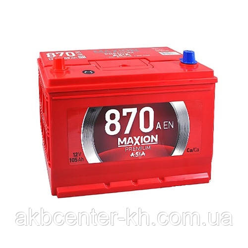 Автомобільний акумулятор MAXION PREMIUM ASIA 6СТ — 105 Аз JP Plus L — преміальна вікова батарея, лідер сегмента преміумкласу. Струм стартерного розряду збільшений до 30%, підвищені антикорозійні властивості пластин. Абсолютно безпечна завдяки використанню спеціальної конструкції кришки. Забезпечена повна необслуговуваність батареї. Призначена для автомобілів із підвищеним енергоспоживанням та експлуатацією в умовах мегаполісу (часті зупинки, рух на зниженій швидкості).